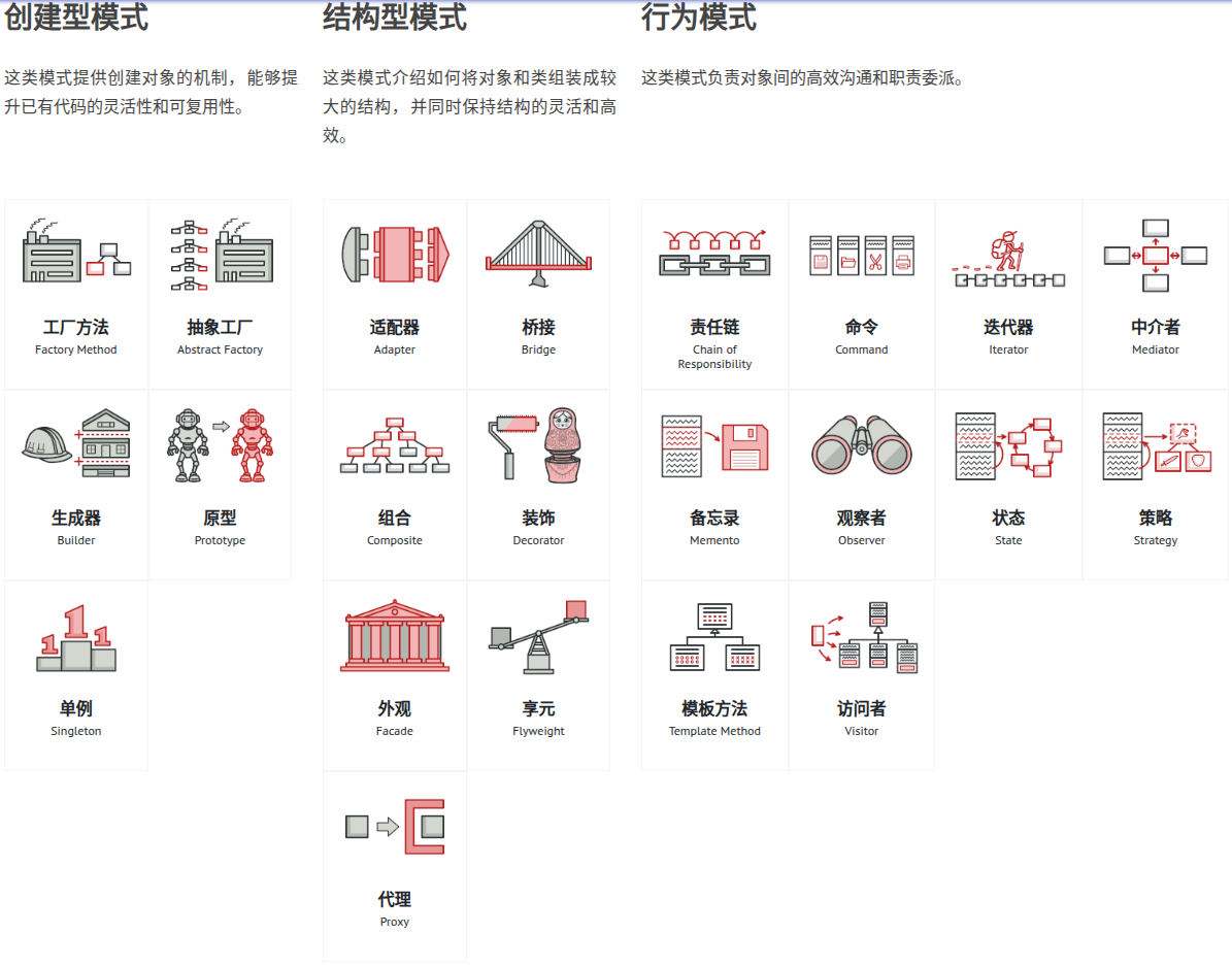 - 在不同语言中的实现提供流行编程语言的代码, 让读者更好地理解模式背后的思想。