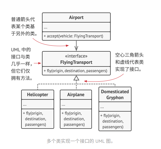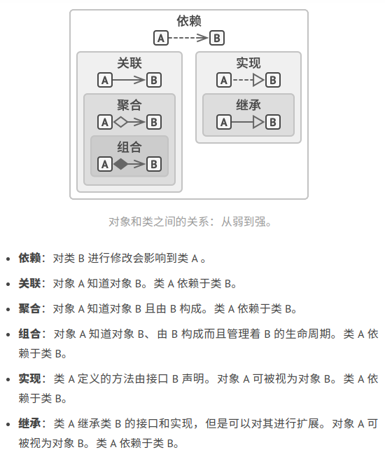 - 实现: 类 A 定义的方法由接口 B 声明。 对象 A 可被视为对象 B。 类 A 依赖于类 B。