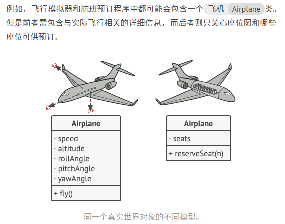 例如, 飞行模拟器和航班预订程序中都可能会包含一个 飞机Airplane类。 但是前者需包含与实际飞行相关的详细信息, 而后者则只关心座位图和哪些座位可供预订。