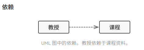 依赖是类之间最基础的、 也是最微弱的关系类型。 如果修改一个类的定义可能会造成另一个类的变化, 那么这两个类之间就存在依赖关系。