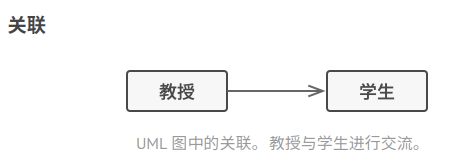 关联是一个对象使用另一对象或与另一对象进行交互的关系。 在 UML 图中, 关联关系用起始于一个对象并指向其所使用的对象的简单箭头来表示。 顺带一提, 双向关联也是完全正常的, 这种情况就用双向箭头来表示。 关联可视为一种特殊类型的依赖, 即一个对象总是拥有访问与其交互的对象的权限, 而简单的依赖关系并不会在对象间建立永久性的联系。