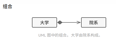 组合是一种特殊类型的聚合, 其中一个对象由一个或多个其他对象实例构成。 组合与其他关系的区别在于组件仅能作为容器的一部分存在。 在 UML 图中, 组合与聚合关系的符号相同, 但箭头起始处的菱形是实心的。
