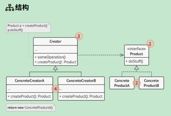 - 创建者 (Creator) 类声明返回产品对象的工厂方法。 该方法的返回对象类型必须与产品接口相匹配。